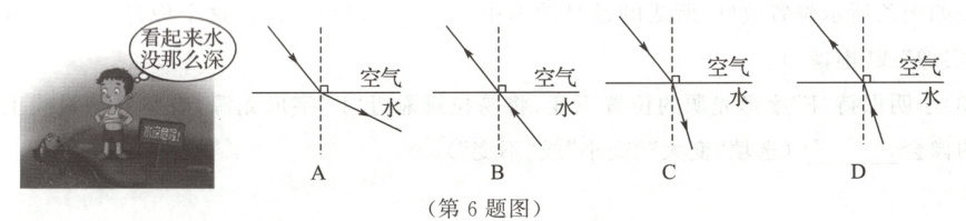 6.新情境安全教育如图所示,当你站在岸边,看到清澈见底、深度不过齐腰的水时,千万不要贸然下去,以免因为对水深估计不足而发生危险。能正确说明产生这一错觉的光路图是 (