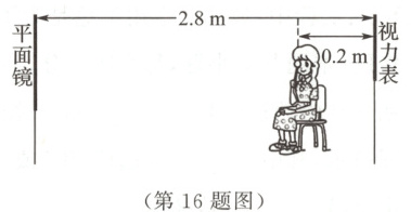 16.视力监测是儿童青少年近视预防工作的重要一环。为了准确测量学生视力,通常要求眼睛与视力表保持5m的距离。由于房间长度只有2.8m,医生把视力表放在被测者头部的后上方,让被测者识别对面墙上平面镜中的像(如图所示)。平面镜所成的是