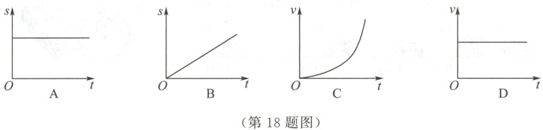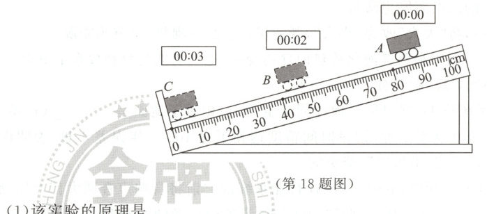 18. (7分)小美在电视机前观看滑雪比赛时,发现运动员下坡时越来越快。为了研究物体从斜面上滑下时的速度大小变化的规律,他设计了如图所示的实验装置,使小车从斜面顶端由静止下滑,并记录了小车到达A、B、C三处时电子秒表(单位:s)所显示的时间。