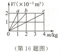 16.分别由a、b、c三种不同物质组成的三个实心体,它们的体积和质量的关系如图所示,由图可知