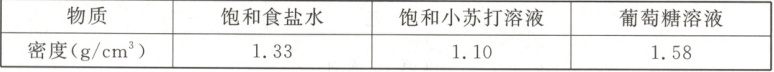 5.小强做家庭小实验的过程中,将饱和食盐水、饱和小苏打溶液、葡萄糖溶液的标签混淆,他将这几种溶液分别装在规格相同的甲、乙、丙三个杯子里。其中$m_{甲}>m_{乙}$,$V_{甲}=V_{乙}$;$m_{乙}=m_{丙}$,$V_{乙}<V_{丙}$。通过查密度表,丙杯中的液体是