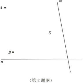 2. 如图,电信部门要在$S$区修建一座电视信号发射塔,按照设计要求,发射塔到两个城镇$A$,$B$的距离必须相等,到两条高速公路$m$和$n$的距离也必须相等.发射塔应修建在什么位置?请你利用尺规作图在图中标出发射塔的位置.(保留作图痕迹,不写作法)