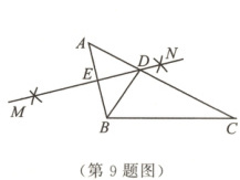 9.如图,在$\bigtriangleup ABC$中,分别以点$A$,$B$为圆心,大于$\frac{1}{2}AB$的长为半径作弧,两弧相交于点$M$,$N$,作直线$MN$,交$AC$于点$D$,交$AB$于点$E$,连接$BD.$若$AC = 12$,$BC = 10$,则$\bigtriangleup BCD$的周长为 (