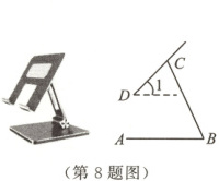8. 新情境 生活运用 创新驱动发展,也使人们的生活更加便捷. 如图是一款手机支撑架,我们可以通过改变面板张角的大小来调节视角舒适度. 小明将该支撑架放置在水平桌面上,并调节面板的张角至视角舒适. 若张角∠BCD = 70°,支撑杆CB与桌面夹角∠B = 65°,则此时面板CD与水平方向的夹角∠1的度数为(