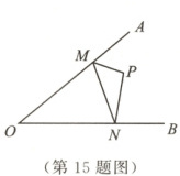 15. 如图,点$P$是$\angle AOB$内一定点,点$M,N$分别是射线$OA,OB$上的点,连接$PM,PN,MN$.若当$\triangle PMN$的周长最小时,$\angle MPN = 100^{\circ}$,则$\angle AOB$的度数是
