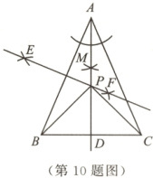 10. 如图,在$\triangle ABC$中,$AB = AC,\angle BAC = 45^{\circ}$.小聪同学利用直尺和圆规完成了如下操作:①作$\angle BAC$的平分线$AM$交$BC$于点$D$;②作边$AB$的垂直平分线$EF$交$AM$于点$P$;③连接$PB,PC$.下列结论错误的是(