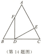 14. 如图,在$\triangle ABC$中,点$D$,$E$,$F$分别是$BC$,$AC$,$AB$上的点,且$BF = CD$,$BD = CE$.若$\angle A = 56°$,$\angle C = 62°$,则$\angle EDF$的度数是