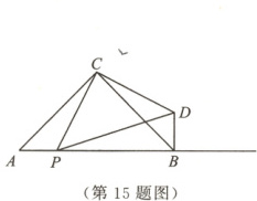 15. 如图,在$ Rt \triangle ABC$中,$\angle ACB = 90°$,$AC = BC$,$AB = 6$,动点$P$从点$A$出发,以每秒2个单位长度的速度在射线$AB$上运动,连接$CP$,以$CP$为直角边向右作$ Rt \triangle CDP$,使$\angle DCP = 90°$,$CP = CD$,连接$BD$.设点$P$的运动时间是$t$秒,当$BD = 2BP$时,$t$的值是