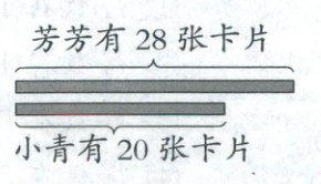 (2) 芳芳送给小青( )张卡片,两人的卡片就同样多。
