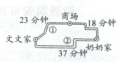 3. 手机也可以用北斗卫星导航系统啦!周末文文一家要去奶奶家,有两条导航路线。路线①用时多少分钟?路线②比路线①少用多少分钟?(6分)
