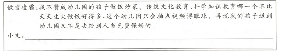 12. 徐海路幼儿园在收获好评的同时,也遇到了一些争议。请结合材料一、材料二的内容,以小文的身份跟帖回复,反驳这位网友的错误观点。(2分)