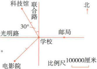 分析 此题考查的是根据方向和距离确定物体的位置。以学校为观测点,邮局在距离学校1500米处的正东方向上,科技馆在学校北偏西$30^{\circ}$方向上,距离学校2000米,根据比例尺可以计算出邮局和科技馆到学校的图上距离,这样就可以找到邮局和科技馆的位置了。在图上测量出电影院到学校的图上距离后,再用图上距离除以比例尺,就可以求出电影院到学校的实际距离。