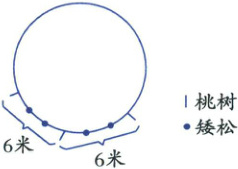分析 如右图,在圆周上植树的问题属于在封闭路线上植树的问题,由此可知栽桃树的棵数等于间隔数。因为在每相邻两棵桃树之间等距离地栽两棵矮松,所以栽矮松的棵数等于栽桃树的棵数×2。要求每相邻两棵桃树之间的两棵矮松相距多少米,用每相邻两棵桃树之间的距离除以(2 + 1)即可。