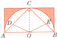(15)(湖南长沙)如下图,三角形$ABC$是等腰直角三角形,点$O$是以$AB$边为直径的半圆的圆心,$AD=\frac{1}{2}CD$,$BC = 3BE$,四边形$CDOE$的面积是21平方厘米,阴影部分的面积是多少平方厘米?