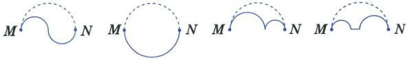 (13) 新情境(天津南开)两只蚂蚁沿不同的路线从点$M$爬到点$N$,甲蚂蚁沿虚线爬,乙蚂蚁沿实线爬。下面四幅图中,两只蚂蚁爬的路线一样长的共有(