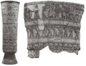 材料 下图是乌鲁克瓶,又称瓦卡花瓶,是在两河流域乌鲁克古城遗址(今伊拉克南部)中女神伊南娜的寺庙建筑群中发现的。制造于大约公元前3200—前3000年间,为苏美尔早期手工艺制品,由乌鲁克匠人制作,是当时的乌鲁克王奉献给神的贡品。花瓶由四组环绕的图案雕刻组成,底部描绘了两河流域的植被,包括椰枣树、芦苇和人工栽培的大麦、小麦等;在这组植被之上是一群动物,包括公羊和绵羊;再向上是一组祭祀中的男子,手中捧着碗和罐子,盛放着水果和谷物;花瓶顶部,美索不达米亚的丰饶女神伊南娜站立于前,身后有两束芦苇,民众正在向她供奉一碗水果和谷物,穿着礼仪短裙和长腰带的乌鲁克人面对着她,引领着一群虔诚的信仰者。