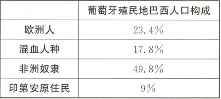 11.D 解析:从材料数据看,非洲奴隶占巴西总人口近半数,欧洲移民和混血人种比例也较高,这与葡萄牙殖民巴西期间的历史活动直接相关。约从16世纪起,葡萄牙为开发巴西种植园经济,通过黑奴贸易将大量非洲人贩运至美洲,导致非洲奴隶成为当地人口主体;同时,欧洲移民持续迁入,并与非洲人、原住民通婚形成混血群体,故选D项。