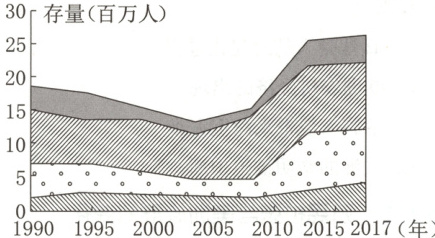 15. 下图展现了 1990 年以来世界难民和寻求庇护者