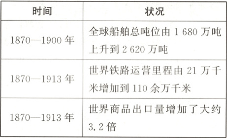 2.A 解析:从表格中的数据可以看出,19世纪中后期至20世纪初,全球交通有了很大发展,世界商品出口量显著增加。这说明全球的经济联系日益密切,故选A项。