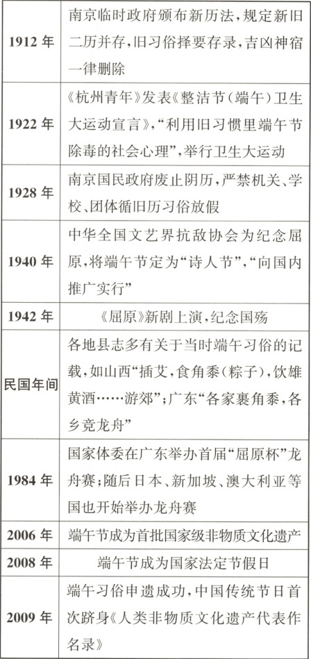 材料一 端午节由来已久,其起源有纪念屈原、吴越民族图腾祭、恶月恶日避毒除害等说法。古代各地的端午习俗包括,“以五彩丝系臂”祈求“不病瘟”“采艾以为人(人形),悬门户上,以禳毒气”,以竹筒贮米,投水以祭屈原,“蹋百草”“斗百草”“龙舟竞渡”,出嫁女“归宁(回娘家)”等。