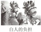 6. 如图为美国在 1899 年发表的漫画《白人的负担》,其描述了这样的情形:代表英国的约翰牛和代表美国的山姆大叔,分别背着自己“未完全驯化的殖民地、半殖民地子民”,两人气喘吁吁、汗流浃背,正一步步跨过野蛮、压迫、迷信、腐败、残酷、邪恶等岩石,奋力向世界“文明的高峰”攀登。 这一作品 (
