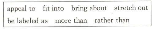 二、1. stretch out 2. is labeled as 3. appeal to 4. fit into 5. more than