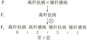 8.B 解析:杂交的目的是将控制无芒和抗病的基因集中到子一代中,从而使后代中出现目标类型,A正确。两对相对性状的杂交实验中,F2的性状分离比为9:3:3:1,其前提条件有控制这两对相对性状的基因位于非同源染色体上、F1不同类型的雌雄配子发育良好且能随机结合、F2的所有个体存活率相同、供实验的群体要大、个体数量足够多。F1产生四种数量相同的雌雄配子只是原因之一,B错误。根据题干信息,亲本是有芒抗病小麦(双显)和无芒不抗病小麦(双隐),F2中重组类型(有芒不抗病和无芒抗病,两种单显)的个体数占F2总数的6/16=3/8,C正确。子二代中无芒抗病植株自交的目的是筛选子二代中的纯合子,同时也能提高纯合子的比例,D正确。