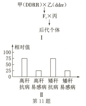 11.B 解析:两个纯合的玉米品种甲(DDRR)和乙(ddrr)杂交得F1(DdRr),再让F1与玉米丙杂交得到后代比例如图Ⅱ,根据图Ⅱ,子代表型为高秆:矮秆=1:1,抗病:易感病=3:1,可以判断亲本丙为ddRr,A错误;丙的基因型为ddRr,丙个体自交,产生的子代中矮秆抗病个体(ddR_)占1×3/4=3/4,B正确;F1的基因型为DdRr,F1自交,则F2中纯合子有DDRR、DDrr、ddRR和ddrr,占1/4,C错误;图Ⅱ中矮秆易感病个体(ddrr)都是纯合子,高秆个体(Dd_)都是杂合子,D错误。