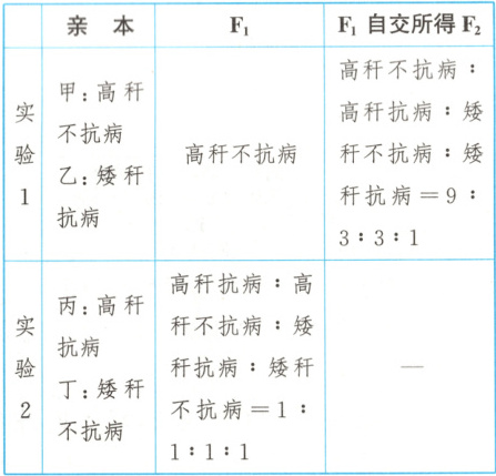 。(3)选择实验 1 的 $F_2$ 中高秆不抗病植株并让其自交,分别统计单株自交后代的表型,只有一种表型的记作 $F_3$-1,有两种表型的记作 $F_3$-2,有四种表型的记作 $F_3$-3。产生 $F_3$-3 的 $F_2$ 植株所占的比例是