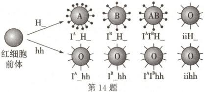 14.D 解析:控制孟买血型的两对基因彼此独立遗传,符合自由组合定律,A正确;孟买血型中的O型血个体有8种基因型:iiHH、iiHh、IAIAhh、IAihh、IBIBhh、IBihh、IAIBhh、iihh,B正确;由题图可知,在含有H基因的前提下,ABO血型才能正常表达,如果不含H基因,则均为O型血,故不能简单地用ABO血型判断亲子关系,C正确;IAIBhh(O型血)×iiHH(O型血)→IAiHh(A型血)、IBiHh(B型血),D错误。