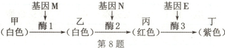 8.C 解析:据题图可知,M_N_ee为红色花,M_N_E_为紫色花,其余为白色花,现有紫色花植株自交,F₁表型及比例为白色花:红色花:紫色花=28:9:27,即F₁中紫色花为27/64=3/4×3/4×3/4,因此亲代紫色花为三杂合个体,即亲本紫色花基因型为MmNnEe,A正确;亲本紫色花基因型为MmNnEe,F₁共有基因型3×3×3=27(种),红色花(M_N_ee)基因型有2×2×1=4(种),紫色花(M_N_E_)基因型有2×2×2=8(种),其余都为白色花,因此白色花基因型有27-4-8=15(种),B正确;F₁中纯合子共有8种,红色花和紫色花都只有1种纯合子,因此白色花中纯合子为6种,F₁中白色花纯合子比例为6/64=3/32,C错误;F₁红色花中只有1种纯合子,比例为1/9,因此杂合子比例为8/9,D正确。