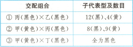2.D 解析:分析表中信息可知,杂交组合①丙(黑色)×乙(黑色)→后代12(黑)、4(黄),后代发生了性状分离,因此黑色为显性性状,黄色为隐性性状,则组合①亲本丙(黑色)和乙(黑色)均为杂合子;组合②甲(黄色)×丙(黑色)→后代8(黑)、9(黄),后代黑色:黄色=1:1,符合测交的结果,说明组合②亲本甲(黄色)为隐性纯合子,丙(黑色)为杂合子;③甲(黄色)×丁(黑色)→后代全为黑色,说明亲本丁(黑色)为纯合子,且甲(黄色)为隐性纯合子。