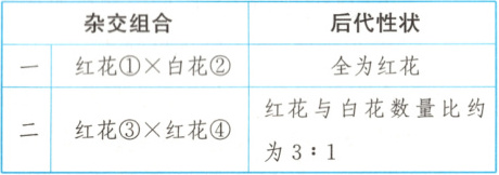 3.C 解析:分析表格,实验一中,红花①×白花②→后代均为红花,说明红花相对于白花是显性性状,则①的基因型为RR,②的基因型为rr;实验二中,红花③×红花④→后代性状分离比为3:1,说明③④的基因型均为Rr,即红花③与红花④的基因型相同,C正确,A、B、D错误。