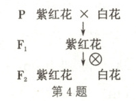 4.D 解析:设相关基因用A、a表示,亲本为紫红花和白花杂交,F₁都为紫红花,因此紫红花为显性,双亲纯合,则亲本为AA、aa,F₁为Aa,F₁自交产生F₂为紫红花(A_):白花(aa)=3:1,A正确;若F₂植株(1/4AA、1/2Aa、1/4aa)自交,子代中白花所占比例为1/2×1/4+1/4=3/8,紫红花所占比例为5/8,则F₃中紫红花:白花=5:3,B正确;若F₂紫红花植株(1/3AA、2/3Aa)自交,则子代中白花所占比例为2/3×1/4=1/6,C正确;荷兰豆属于自花传粉的植物,进行人工异花传粉时,母本需去雄蕊、父本不需要去雌蕊,D错误。