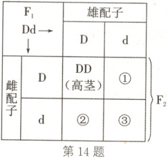 14.C 解析:识图分析可知,①由d雄配子和D雌配子结合,遗传因子组成为Dd,性状表现为高茎,②由D雄配子和d雌配子结合,遗传因子组成为Dd,性状表现为高茎,A错误;③由d雌配子和d雄配子结合,遗传因子组成为dd,③与F₁(Dd)的遗传因子组成不同,B错误;受精时,雌雄配子随机结合,C正确;F₂中,DD:Dd:dd=1:2:1,其中杂合子占1/2,D错误。