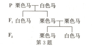 3.D 解析:根据题图可知,马的栗色对白色为显性,故亲代栗色马和白色马的基因型分别是Bb、bb。F₁栗色马和栗色马交配,产生的F₂中含有白色马,说明F₁栗色马的基因型均是Bb,因此F₂栗色马的基因型有2种,栗色马中的纯合子所占比例为1/3。综上所述,A、B、C正确,D错误。
