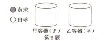 6.C 解析:由题干信息可知,基因型及比例为YY∶Yy=1∶1,故产生雌配子的比例为Y∶y=3∶1,雄配子的比例为Y∶y=3∶1,甲、乙容器中均放黄球30个、白球30个不符合配子比例,A错误;该装置中甲、乙容器分别代表雄性和雌性生殖器官,其中的小球可表示配子,该装置能用来进行性状分离比的模拟实验,B错误;产生雌配子的比例为Y∶y=3∶1,雄配子的比例为Y∶y=3∶1,甲、乙各取一球,两球颜色相同的概率为3/4×3/4+1/4×1/4=5/8,C正确;正常情况下雄配子数目远多于雌配子,甲、乙容器中黄球和白球总数不需要一定相等,D错误。