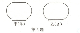 5.C 解析:多株红色(由显性基因A控制)辣椒作母本,与黄色(由隐性基因a控制)辣椒突变体作父本进行杂交,子代辣椒红色和黄色的比例为3∶1,说明亲本红色个体产生的配子A∶a=3∶1,所以甲容器(模拟的是母本的雌性生殖器官)中两种颜色的彩球即配子,比例为3∶1,A错误;乙容器模拟的是父本(基因型为aa)的雄性生殖器官,没有等位基因,故从乙容器中抓取彩球的过程,不能模拟等位基因的分离,B错误;从甲、乙容器内各抓取一个彩球组合在一起,代表雌雄配子的结合,即为杂交中的受精过程,C正确;每次抓取彩球记录好后,应将抓取的彩球放回原来的容器内,再将容器内彩球摇匀后重复实验,D错误。