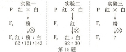 15.(2025·江苏泰州期中)某研究人员发现某种花的颜色(红、粉、白)由两对位于常染色体上 A/a 基因和 B/b 基因控制,其中 A 基因对 a 基因为显性,控制红色素的合成,B 基因控制颜色的深浅,且具有叠加效应。某科研人员选取若干纯合子作为亲本杂交,过程如图所示。已知实验一和实验三中 F1 的粉花基因型不同。回答下列问题: