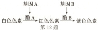 12. 某植物与花色有关的前体物质(白色色素)经一系列代谢过程可合成紫色色素,此过程由 A、a 和 B、b 两对独立遗传的等位基因共同控制(如图所示)。将基因型为 AABB 的个体与基因型为 aabb 的个体杂交得到 F1,F1 自交得到 F2。下列有关分析错误的是(