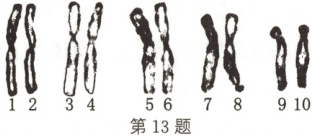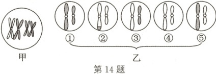 13.B 解析:1个四分体=1对同源染色体,图中5对同源染色体可形成5个四分体,A正确;减数分裂Ⅰ前期,同源染色体的非姐妹染色单体之间可发生缠绕并交换片段,染色体2和3是非同源染色体,B错误;减数分裂Ⅰ后期,同源染色体分离,非同源染色体自由组合,染色体5与6是同源染色体,不会位于细胞同一极,C正确;减数分裂Ⅱ后期,细胞内染色体数目与体细胞中的染色体数目相同,即与图中的相同,D正确。