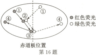 16.C解析:观察到两个荧光点随时间依次出现在细胞中①(两条染色体散乱排列)→②(两条染色体联会)→③(两条染色体排列在赤道板上)→④(两条染色体分离),因此判断该细胞正在进行减数分裂,A正确;图示①→②阶段发生了同源染色体的联会,因而推测这两条染色体是一对同源染色体,B正确;荧光点从③向④的移动过程中发生了同源染色体分离,没有发生着丝粒分裂,C错误;这两条染色体是一对同源染色体,分别被红色荧光和绿色荧光标记,该细胞分裂后得到的两个子细胞中分别含有这两条染色体中的一条,因此都只有一种颜色的荧光点,D正确。