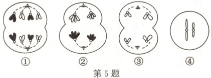 5.C 解析:①②中都有8个核DNA分子,A正确。①③④中着丝粒分裂,都没有染色单体,B正确。③中不含同源染色体,且着丝粒分裂,染色体移向细胞两极,处于减数第二次分裂后期;④细胞中不含同源染色体,且染色体数目减半,处于减数第二次分裂末期。动物为雌性动物,因此③为极体,不可能是次级精母细胞,C错误。①细胞中含有同源染色体,且着丝粒分裂,处于有丝分裂后期;②细胞中含有同源染色体,且同源染色体分离,处于减数第一次分裂后期;③细胞中不含同源染色体,且着丝粒分裂,染色体移向细胞两极,处于减数第二次分裂后期;④细胞中不含同源染色体,且染色体数目减半,处于减数第二次分裂末期。若图示细胞分裂具有连续性,则顺序为①②③④,①为卵原细胞的有丝分裂,D正确。