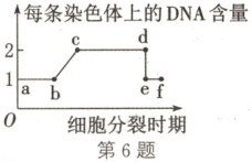 6.B 解析:若该图为减数分裂,cd段每条染色体上含有2个DNA分子,则cd段可表示减数第一次分裂和减数第二次分裂前期、中期,细胞含有23对同源染色体或23条染色体,A错误;若该图为减数分裂,则基因的分离和自由组合都发生在减数第一次分裂后期,即cd段的某一时期,B正确;根据题意可知,该细胞为人体细胞,人体细胞有丝分裂过程中不会出现细胞板,且纺锤体出现在分裂前期,即cd段,C错误;若该图为有丝分裂,则ef段表示有丝分裂后期和末期,ef段细胞的核DNA分子数为92个,但细胞中还含有细胞质DNA,因此细胞中的DNA分子数不止92个,D错误。