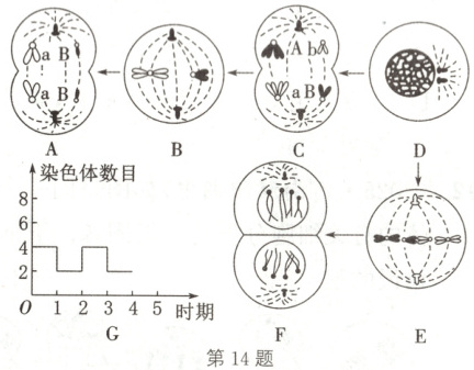 14.某高等动物体细胞内含有A、a、B、b4条染色体。如图中A~F表示其睾丸内细胞分裂图像;G表示某个细胞分裂过程中染色体数目变化曲线。请据图回答: