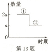 13.B 解析:若曲线表示每条染色体上DNA数量的变化,减数分裂Ⅱ后期由于着丝粒分裂,姐妹染色单体分开,每条染色体上DNA数量由2个变1个,故②阶段为减数分裂Ⅱ后期,A正确;若曲线表示减数分裂过程中染色单体数量的变化,从①到②染色单体数量减半,没有消失,所以应是减数第一次分裂结束从4N→2N即从16条减为8条,故a的值为8,B错误;若曲线表示减数分裂过程中染色体数量的变化,从①到②染色体数减半,因此应该是从8→4,故a的值为4,C正确;精巢中有大量精原细胞,精原细胞可进行有丝分裂或减数分裂,故精巢中可同时观察到进行有丝分裂的细胞和减数分裂的细胞,D正确。