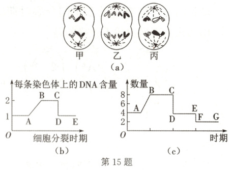 15.(2024·江苏盐城东台一中期中)图(a)表示某高等动物(2n=4)器官内正常的细胞分裂图,图(b)表示细胞分裂的不同时期每条染色体上的DNA含量变化曲线,图(c)表示减数分裂过程中细胞核内某物质的数量变化曲线。请回答下列问题: