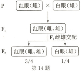 14. 摩尔根及其团队在研究果蝇眼色时,偶然发现了一只白眼雄果蝇,让该白眼雄果蝇与红眼雌果蝇杂交,F₁全为红眼,F₁中的雌雄个体交配,获得的F₂中白眼占1/4,且都是雄果蝇(如图)。回答下列问题: