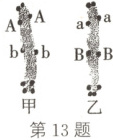 13. (2025·山东淄博段考)(多选)如图是果蝇的一个初级精母细胞中的甲、乙两条染色体,染色体上的黑点代表了部分基因(一个黑点就代表一个基因),其中有两对基因用A/a、B/b表示,这部分基因的位置是通过现代生物学技术标记显示出来的。下列相关说法错误的是 (