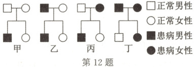 12.A 解析:色盲是伴X染色体隐性遗传病,家系甲中,父母均正常,但有一个患病的儿子,说明甲病是隐性遗传病,可能是红绿色盲,根据乙图无法确定乙病的遗传方式,但肯定不是伴X染色体显性遗传病,可能是红绿色盲,根据丙图无法确定丙病的遗传方式,可能是红绿色盲,根据丁图可确定丁病为显性遗传病,不可能是红绿色盲,A错误;抗维生素D佝偻病是伴X染色体显性遗传病,甲是隐性遗传病,不可能是抗维生素D佝偻病,乙肯定不是伴X染色体显性遗传病,故肯定不是抗维生素D佝偻病遗传的家系是甲、乙,B正确;家系甲中,甲病是隐性遗传病,设相关基因为A、a,若该病是常染色体隐性遗传病,则双亲的基因型为Aa,再生一患病孩子的概率为1/4,若是伴X染色体隐性遗传病,则双亲的基因型为XᴬXᴬ、XᴬY,再生一患病孩子的概率为1/4,C正确;家系丙中遗传病的遗传方式不能确定,若为伴X染色体显性遗传病,则女儿是纯合子,若为常染色体显性遗传病,则女儿是纯合子,若为伴X染色体隐性遗传病,则女儿为杂合子,D正确。